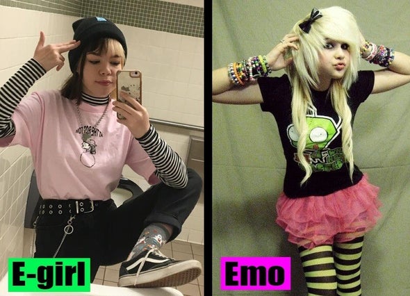 The e-girl/boy fashion looks a lot like the emo fashion, but that's not that weird because their fashion style is inspired by other subcultures, including emo. I personally would describe their style more as anime like. E-girls do also have a more complicated makeup style, they use a lot more colored eyeshadow than emos and they also like to draw little signs on their face with eyeliner. They also like to color their hair in bright colors. But they don't have a speciafic hair style.